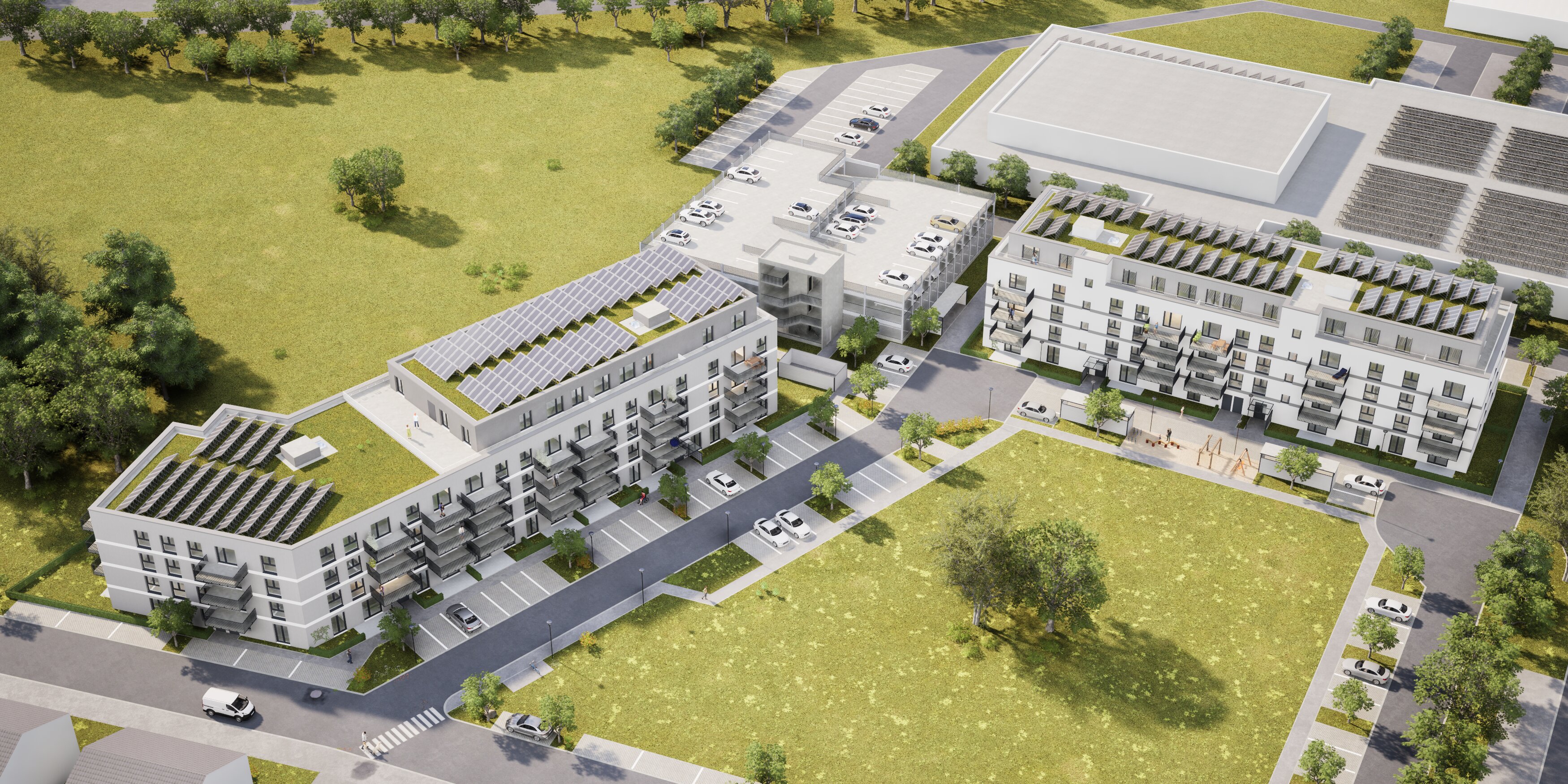 Mit der Wohnanlage Quartier Westend entsteht ein modernes Ensemble aus zwei harmonisch aufeinander abgestimmten Gebäuden. Die beiden fünfgeschossigen Häuser umfassen insgesamt 125 Wohneinheiten mit Größen zwischen 57 qm und 106 qm und bieten damit Raum für unterschiedlichste Lebensentwürfe. Die Wohnvielfalt spiegelt sich in einer Auswahl von 2-, 3- und 4-Zimmer-Appartements wider, die durch durchdachte Grundrisse und lichtdurchflutete Räume überzeugen. Ein integriertes Parkhaus sorgt für komfortables und sicheres Parken, während begrünte Außenanlagen eine angenehme Aufenthaltsqualität bieten und zur Gemeinschaft einladen.